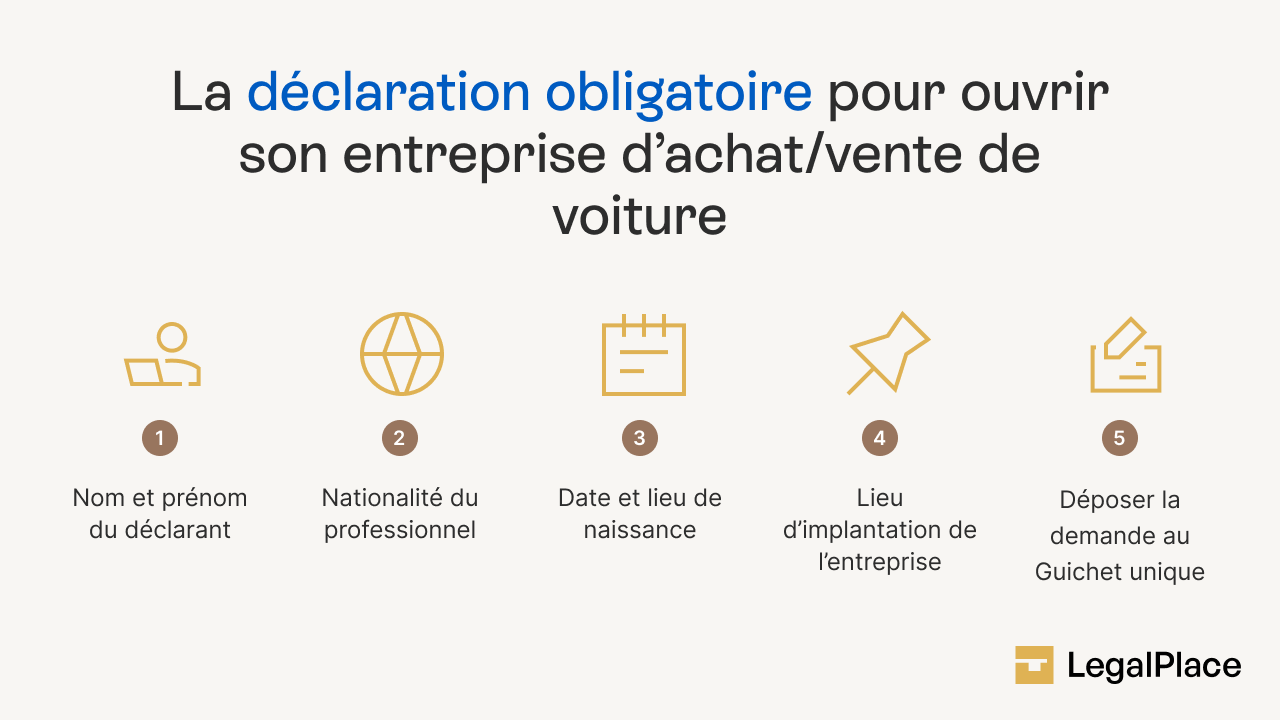 L’acheteur-revendeur automobile doit s’inscrire au registre des revendeurs d’objets mobiliers usagés. Cette démarche consiste à renseigner le formulaire 11733*01, qui sera ensuite fourni à la préfecture du lieu d’installation de l’entreprise. La déclaration contient obligatoirement :