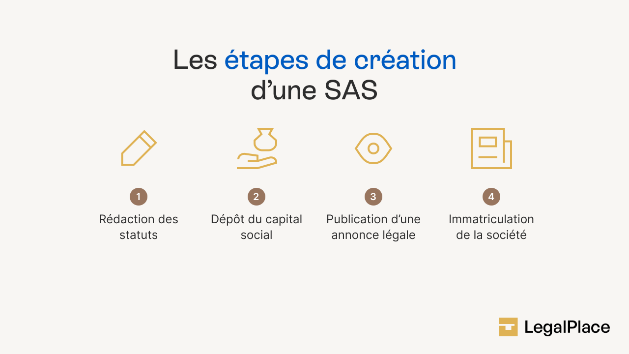 🔎 Zoom : Créer une SAS peut s’avérer complexe. C’est pourquoi LegalPlace propose de créer votre SAS en ligne simplement et rapidement ! Pour ce faire, il suffit de remplir notre questionnaire et de nous transmettre les documents demandés. Notre équipe se charge ensuite de toutes les formalités, de la génération des statuts jusqu’à l’immatriculation, en passant par la publication de l’annonce légale de constitution.