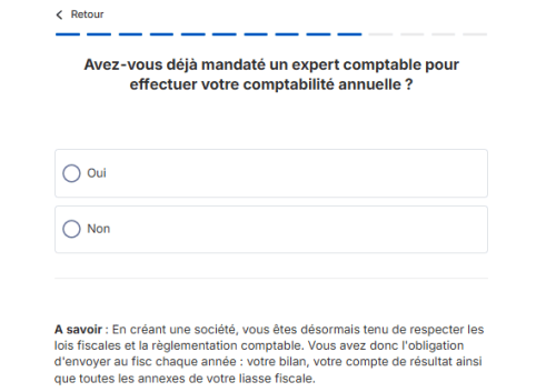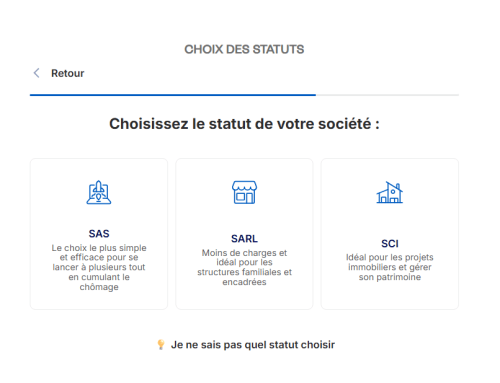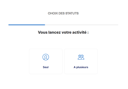 Vous commencez par indiquer si vous créez seul (forme unipersonnelle) ou avec des associés. Cette étape détermine la structure juridique adaptée à votre projet.