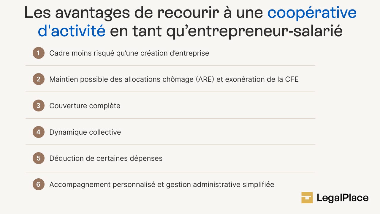 Voici un tableau des différents avantages de recourir à une coopérative d’activité en tant qu’entrepreneur salarié :