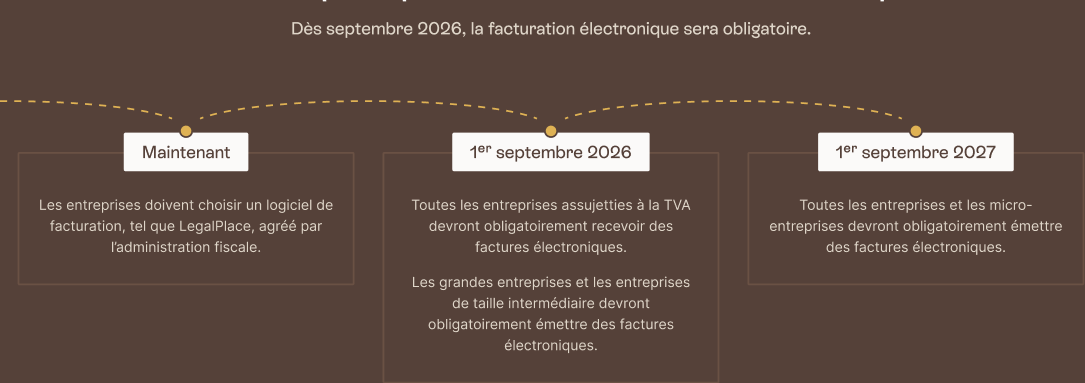 recevoir des factures électroniques pour toutes les entreprises. - 1er Septembre 2027 : obligation d’émettre des factures au format électronique ou de réaliser un e-reporting pour les moyennes, petites et très petites entreprises (y compris les micro-entreprises) au plus tard.